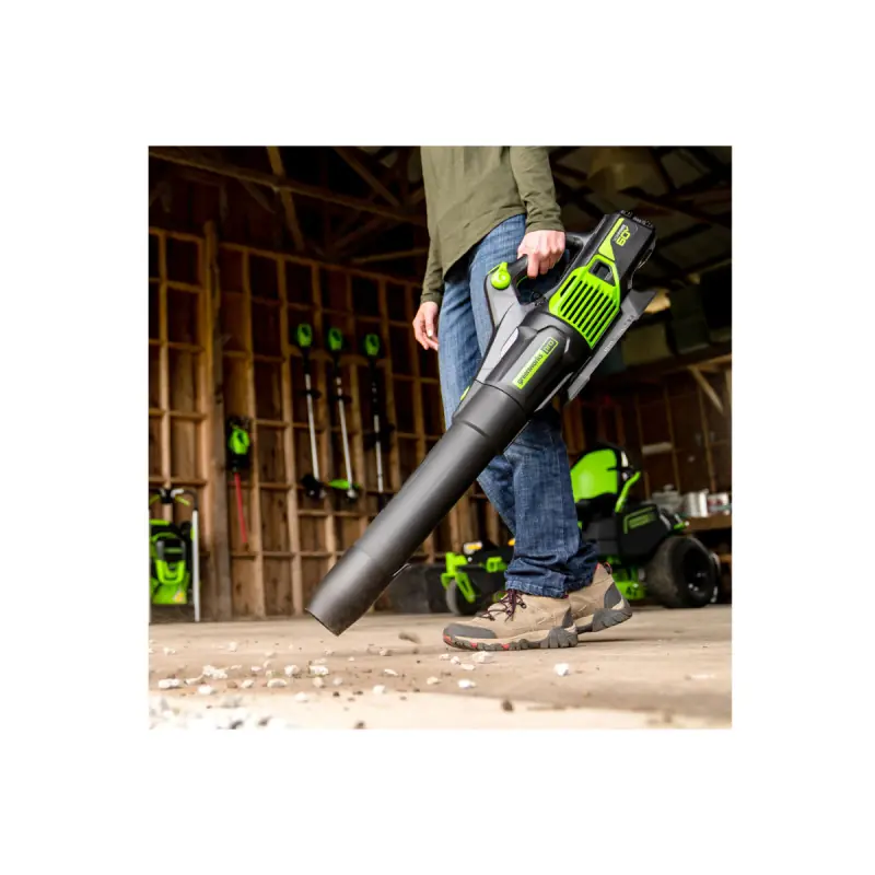 The GREENWORKS 60V Brushless Cordless Blower - Without battery or charger - GD60AB is suitable for clearing leaves on medium to large surfaces. Both lightweight and powerful, it features a variable speed trigger to adapt to your needs, as well as a Brushless motor that ensures better performance and a longer lifespan. The blower is equipped with a Boost function to tackle wet leaves that are more difficult to move. This device works with all 60V Greenworks batteries (sold separately).