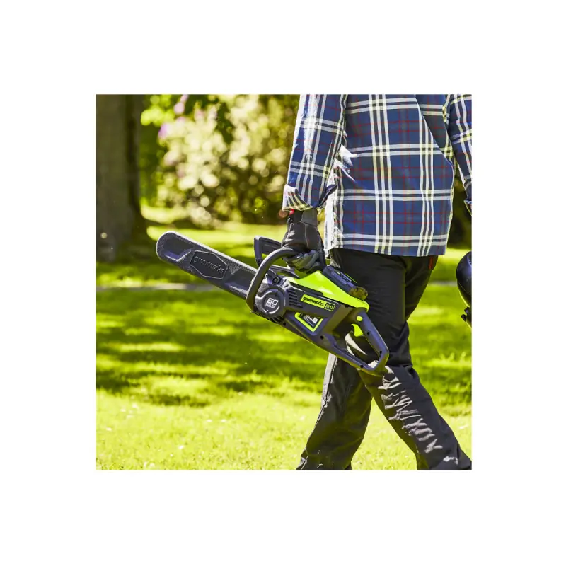 The GREENWORKS 60V Brushless Chainsaw - 40cm Chain - Without battery or charger - GD60CS40 is suitable for performing demanding cuts. It combines power and robustness to ensure solid reliability during use, in addition to delivering performance similar to that of a petrol chainsaw. With its 40 cm cutting bar, you can tackle larger wood cuts or do lighter pruning. The chainsaw operates on a 60V battery (sold separately) and features a Brushless motor that combines high performance with extended lifespan. Safety is also a priority, particularly with a two-button start to prevent accidental activation and a chain brake capable of stopping immediately.