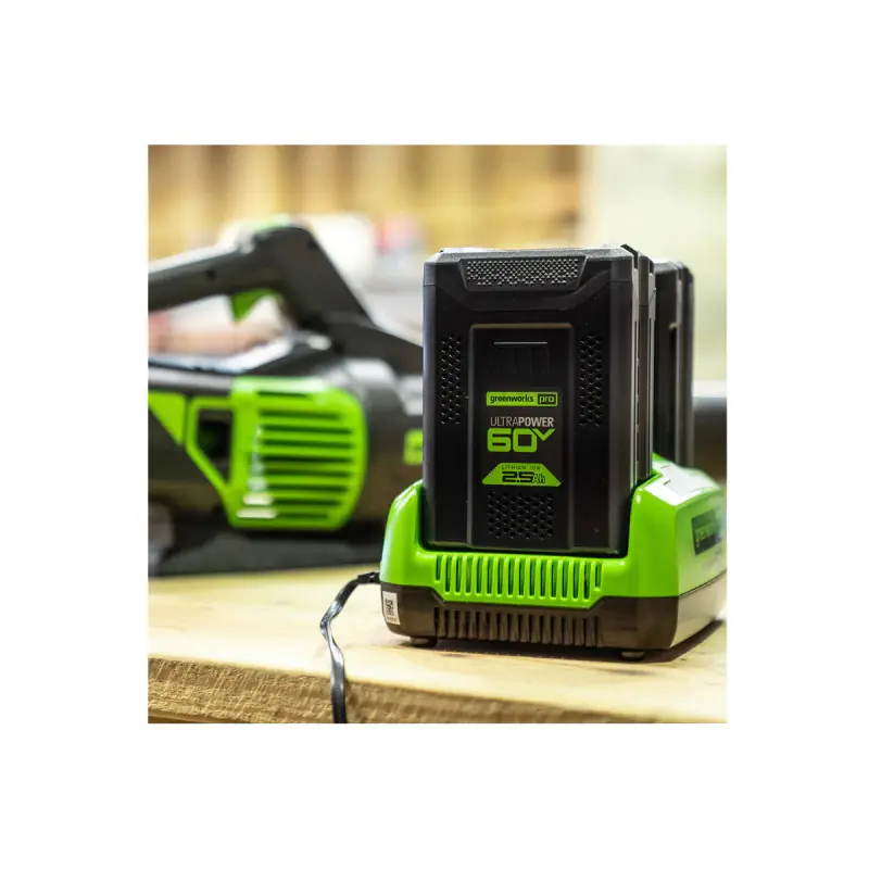 The GREENWORKS 60V - 6 0Ah - G60x2UC6 rapid dual charger is essential for charging any 60V battery from the Greenworks brand. This charger stands out from traditional ones as it has two ports to accommodate two batteries at the same time. A LED indicator will allow you to monitor the charge level during use, and two other light indicators help check the temperature of the batteries as well as detect any issues.