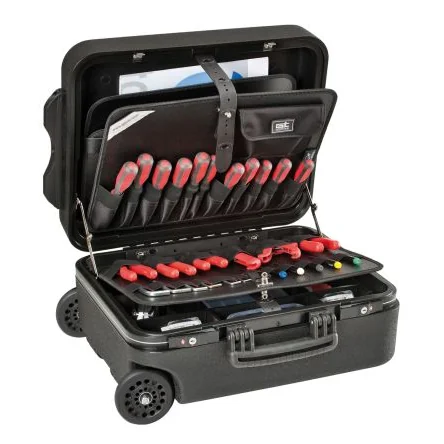 Durable polyethylene tool case with wheels for easy transport and organization.