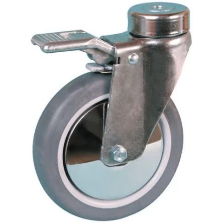 EUROLUX bed castors. Pressed steel chrome-effect frame. Grey (RAL 7001) polypropylene copolymer wheel with grey (RAL 7005) thermoplastic rubber tyre. Quiet and easy to push, non-marking. Designed for handling care beds and hospital beds.