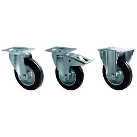 Black rubber castors with steel plate. Handling castors with pressed steel frame. Pivot on two bearing crowns and feature shiny, zinc-plated protection. Wheel with full black rubber tyre, zinc-plated steel body, roller bearings and bolted shaft. Applications: handling with risk of side impacts.