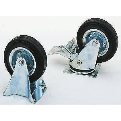 Black rubber castors with steel plate. Handling castors with pressed steel frame. Pivot on two bearing crowns and feature shiny, zinc-plated protection. Wheel with full black rubber tyre, zinc-plated steel body, roller bearings and bolted shaft. Applications: handling with risk of side impacts.