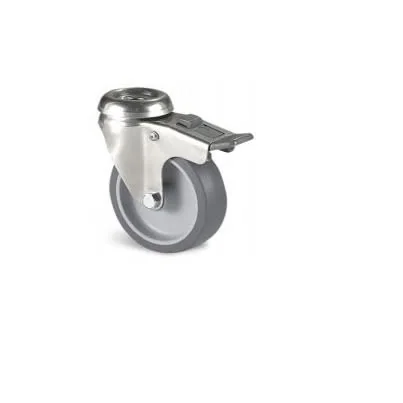 The Guitel Hervieu swivel and brake castor wheel with pressed stainless steel has 100 mm diameter. This castor swivel on two rows of balls and has a central bolt hole fitting. Wheel centre made of Grey Polypropylene.Low starting effort Bonded rubber Corrosion resistant and easy to clean Suited for food industry, hospital or industrial kitchen equipment