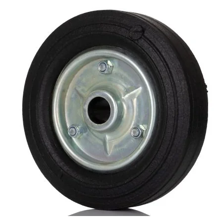 Wheel Size refers to the size of wheel hub plus tyre. Black Solid Rubber Tyred Wheel, Centaure Series . Solid rubber ‘Cushion ‘ effect tyres Zinc plated steel riveted centres