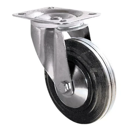 Large plate rubber castors. These castors support loads of 175 to 200 kg. As with other plated handling castors, these castors feature a rubber tyre and wheel body in black polypropylene copolymer. Pivot on two crown bearings. Black tyre for wheels Ø 160 mm and white for wheels Ø 200 mm. Zinc plated threadguard. Applications: standard handling on industrial surfaces.
