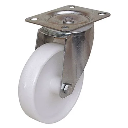 Large plate polychoc castors. Handling castors with plate, single piece polychoc wheel, steel roller bearing. Support loads up to 400 kg. Embossed zinc plated steel frame. Applications: standard handling on hard and good condition surfaces.