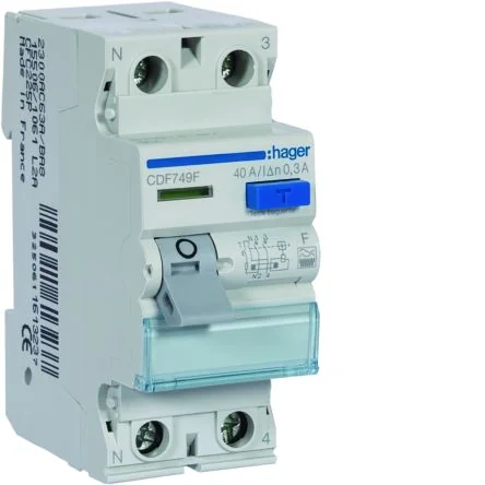Hager CDF RCCB, 40A, 2 Pole, 30mA, Type F, 230V ac - CDF749F