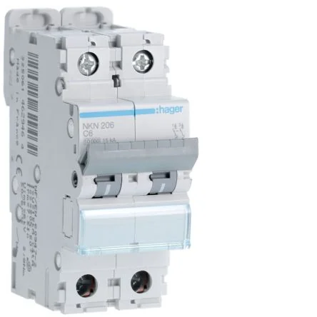 Hager NKN206 Circuit Breaker with 2 poles, 6A rating, and 15 kA breaking capacity for reliable electrical protection.