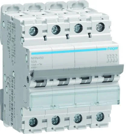 Hager NRN450 Circuit Breaker with 4 poles, 50A rating, and 15 kA breaking capacity for reliable electrical protection.