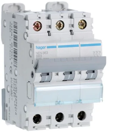 Hager NEN MCB 3P 63A provides reliable circuit protection with a breaking capacity of 10 at 400V AC.
