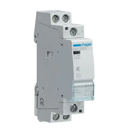 Certified according to NF EN 61095 (except ESDx4x, ESDx6x, ESC241, ESC264, ESC441 and ESC464). Hager Contactors. The Hager ESC / ESD contactors are designed to control heating circuits, lighting and ventilation. They can also control energy management devices, such as programmers, thermostats, time delay relays. The ESCxxxS are quiet versions recommended for use in residential areas. Silent operation is guaranteed over time, the impact noise during switching is reduced. Features and Benefits. Contactor without manual control Modular design 24 V or 230 V coil 25 A to 63 A contact rating Screw connection DIN Rail mountable RoHS compliant