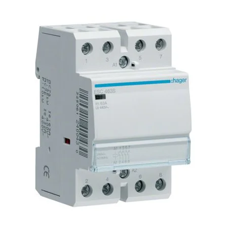 Certified according to NF EN 61095 (except ESDx4x, ESDx6x, ESC241, ESC264, ESC441 and ESC464). Hager Contactors. The Hager ESC / ESD contactors are designed to control heating circuits, lighting and ventilation. They can also control energy management devices, such as programmers, thermostats, time delay relays. The ESCxxxS are quiet versions recommended for use in residential areas. Silent operation is guaranteed over time, the impact noise during switching is reduced. Features and Benefits. Contactor without manual control Modular design 24 V or 230 V coil 25 A to 63 A contact rating Screw connection DIN Rail mountable RoHS compliant