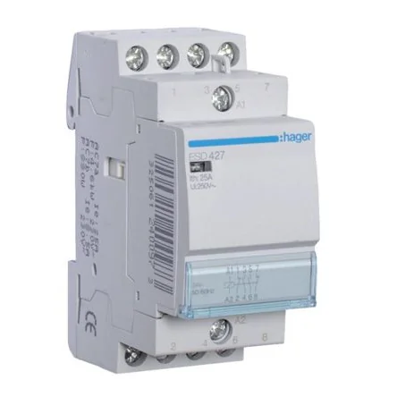 Certified according to NF EN 61095 (except ESDx4x, ESDx6x, ESC241, ESC264, ESC441 and ESC464). Hager Contactors. The Hager ESC / ESD contactors are designed to control heating circuits, lighting and ventilation. They can also control energy management devices, such as programmers, thermostats, time delay relays. The ESCxxxS are quiet versions recommended for use in residential areas. Silent operation is guaranteed over time, the impact noise during switching is reduced. Features and Benefits. Contactor without manual control Modular design 24 V or 230 V coil 25 A to 63 A contact rating Screw connection DIN Rail mountable RoHS compliant