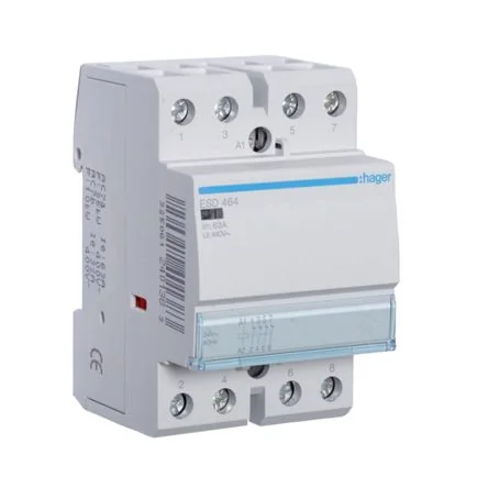 Certified according to NF EN 61095 (except ESDx4x, ESDx6x, ESC241, ESC264, ESC441 and ESC464). Hager Contactors. The Hager ESC / ESD contactors are designed to control heating circuits, lighting and ventilation. They can also control energy management devices, such as programmers, thermostats, time delay relays. The ESCxxxS are quiet versions recommended for use in residential areas. Silent operation is guaranteed over time, the impact noise during switching is reduced. Features and Benefits. Contactor without manual control Modular design 24 V or 230 V coil 25 A to 63 A contact rating Screw connection DIN Rail mountable RoHS compliant