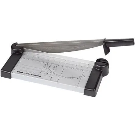 ProCut S 330 Plus Cutting Machine. Lever cutter for paper and film Clamp with high finger guard ridge for optimal grip on material to be cut Markings on cutting table for analogue and digital picture/DIN formats with scales in cm and inches Formats and CD/DVD covers Angle lines for diagonal cuts at 5° intervals Cut height: max. 10 sheets 80 gsm (1.0 mm) Cut length: 33 cm