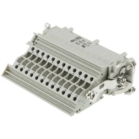 These connectors should not be mated or unmated under electrical load. Connectors of the same or different types arranged in a line should be polarised to prevent the possibility of wrong connection. UL, CSA, SEV. Han E® AV Terminal Blocks. From Han E, these AV terminal blocks are used in conjunction with the bulkhead/panel mount housing to allow a terminal block style wire termination inside the equipment, perfect for customizable connection solutions. Features and Benefits: • Inserts available with 6 to 24 poles plus pre-mating earth • Screw terminal wire acceptance 0.2 to 2.5mm² • Mechanical life of 500 mating cycles • Compatible with the Han E ES AV and Han E AV range of Hoods and Housings