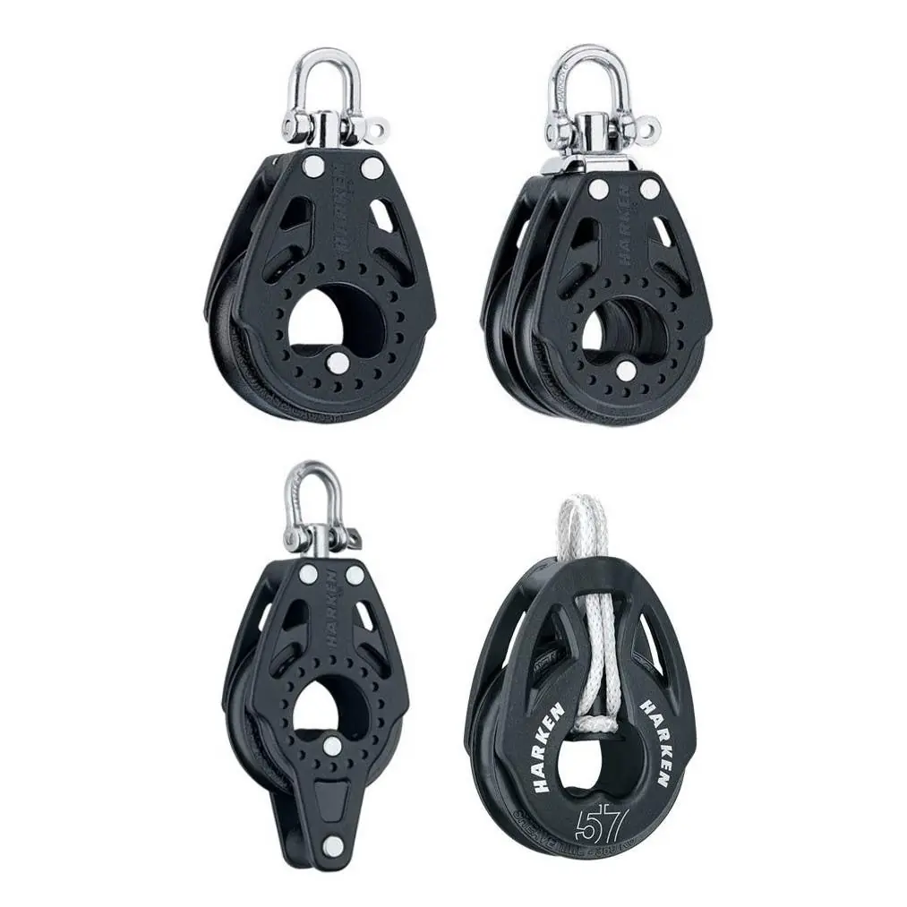 The Harken 57mm Carbo Air Block with Swivel is a lightweight, high-strength pulley designed for smooth and effortless maneuvers in various water activities. Constructed from tough, fiber-reinforced composite materials, this block offers exceptional durability and reliability. Its open 'Air' profiling reduces unnecessary weight, enhancing performance. The free-rotation ball bearings and curved surface sheaves ensure even load distribution, minimizing friction and facilitating precise adjustments. The Cam-Lock or U-Lock locking system secures the shackle in the desired position, preventing rope twisting. With a high working load, this pulley is suitable for boats of all sizes.