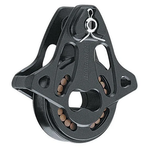 The Harken Black Magic® Air Runner Block is a durable and lightweight component designed for high-performance sailing applications. It features a sheave with a high degree of rotational freedom, enhancing the efficiency of sail controls. The block is equipped with Torlon® roller bearings housed in a central cage, providing a high strength-to-weight ratio and reducing friction. Side running strips are incorporated to dampen vibrations, contributing to smoother operation. The design includes side openings and embedded axle pins within the cheek, creating a sleek aesthetic and preventing line snagging. The heads of the Black Magic® Air Runner Blocks are available with either parallel or perpendicular shackles, and the plates allow for the attachment of tensioners, straps, and other fittings. Installation is tool-free, facilitating quick and easy setup. Optional foam insert socks are available to protect the block, deck, and crew during operation.