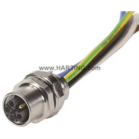 Han M12 PFT Connector, L-Coded. From Harting, this Han M12 panel feed through connector is L-coded. Features and Benefits:. • Wire Gauge of 2.5 mm² • L-coded • Protective Earth Conductor (PE)