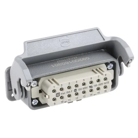 UL, CSA, SEV. Male and female inserts may be fitted to a hood or housing if the installation requires such a reverse configuration. Bulkhead /Panel Sockets. Harting Heavy Duty Power Connectors (HAN Series) are perfect for industrial applications with harsh requirements. Harting has developed this series to help provide a solution for a wide range of needs in mechanical and plant engineering. They are also used in the design, Construction of equipment, In medical technology and construction machinery. Harting provide kits as complete solutions to the HAN connector series. The Harting kits offer one part number solutions that make it easier to order and control inventory. Each Han-Kit includes male and female inserts, screw terminated contacts, side or top entry hood, bulkhead mounted housing, and cable gland. Various HAN metal kits available Available with metal or plastic hoods Right angled or straight bulkhead mount housing available