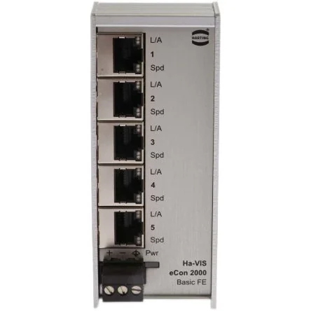 HARTING Unmanaged Ethernet SwitchThe HARTING unmanaged Ethernet switch has 5, RJ45 port and DIN rail mounting. It has a supply voltage rating between 24VDC to 48VDC. The Ha-VIS eCon 2000 series unmanaged Ethernet switch offers a plug and play solution. The switches have a flat construction and frontal port mounting for installation into space-restricted or hard-to-reach applications. The PoE and fibre-optic ports are also available.Features and Benefits2.86 MTBF (in million hours) Non-blocking fast Ethernet switching architecture Auto-negotiation Auto-polarity and auto-MDI(X) provide the user with a plug and play solution Reverse polarity and surge protection Transfer length of 100m via twisted pair Cat. 5 with a 10/100MB/second transfer rate Reduced energy consumption thanks to energy-efficient Ethernet Anodised aluminium housing Operating temperature ranges between -40°C and 70°CApplicationsIndustrial network infrastructure Machinery and robotics Automation Transportation Wind and solar energy ShipbuildingCertificationsCE certified FCC CFR 47 part 15 DNV GL ABS cUL US 508 listed NK ABB IIT IEC 60068-2-6 vibration IEC 60068-2-6 resonance search IEC 60068-2-27 shock test IEEE 802.3 IP30 rated