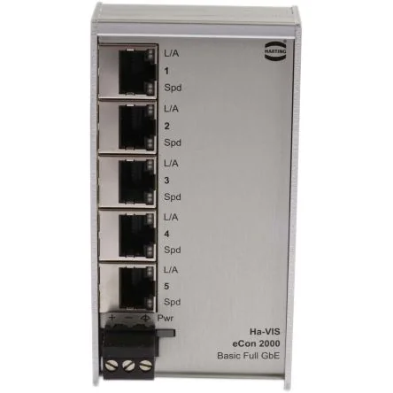 HARTING Ethernet SwitchThe HARTING RJ45 5-port DIN rail mount Ethernet switch. It has an electrical rating of 24VDC to 48VDC. The Ha-VIS eCon 2000 series full Gigabit family of unmanaged Ethernet switch is equipped with up to 7 Gigabit Ethernet ports and allow for cost-efficient and quick expansion and/or reconstruction of network infrastructures with high bandwidth requirements. In this, all variants support extra-long Ethernet frames (jumbo frames). The switches work as power sourcing equipment (PSE) and are capable of simultaneously providing the full PoE output of 34.2watts on up to four ports.Features and BenefitsEnergy supply of up to 4 terminal devices via PoE (137 watts) in accordance with IEEE 802.3at Support of jumbo frames (10 kB) Surge protection and reverse polarity protection Minimum energy consumption due to energy-efficient Ethernet Housing width 120mm Frame size 10kb MAC table size 8k entries Packet buffer size 1MbitApplicationsMachinery & Robotics Automation Industrial Network infrastructures Wind Energy Solar Energy Transportation ShipbuildingCertificationsCE certified IEC 60068-2-6 Vibration IEC 60068-2-6 Resonance search IEC 60068-2-27 Shock test