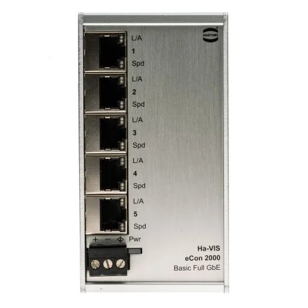 HARTING Unmanaged Ethernet SwitchThe HARTING unmanaged Ethernet switch has 5, RJ45 ports and DIN rail mounting. It has a supply voltage of 24VDC to 48VDC. The Ha-VIS eCon 2000 series full GB family of unmanaged Ethernet switch is equipped with up to 16GB Ethernet ports. It facilitates cost-efficiency, quick expansion, and/or reconstruction of network infrastructures with high bandwidth requirements. All variants support extra-long Ethernet frames (jumbo frames). Owing to the extremely flat design, these switches can be accommodated in installations where space is restricted towards the cable connection at the front. Automatic detection of the transmission rate (auto-negotiation) and the wiring of the twisted pair data cable (auto-polarity and auto-MDI(X)) allow for simple plug and play.Features and Benefits3.06 MTBF (in million hours) Full gigabit Ethernet, non-blocking switch architecture according to IEEE 802.3 Support of jumbo frames (10KB) Surge protection and reverse polarity protection Minimum energy consumption due to energy-efficient Ethernet Housing width 60mm Frame size 10KB MAC table size 8k entries Packet buffer size 1MB Operating temperature ranges between 0°C and 55°CApplicationsMachinery and robotics Automation industrial Network infrastructures Wind energy Solar energy-transportation shipbuildingCertificationsCE certified IEC 60068-2-6 Vibration IEC 60068-2-6 Resonance search IEC 60068-2-27 Shock test