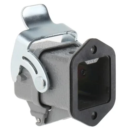 Harting Han A Size 3 A Standard Metal Hoods and Housings. Han A size 3 A standard metal hoods and housings with a slim, space saving design. These Han 3 A hoods and housings are made from robust diecast zinc with an RAL 7037 powder coated surface. The Han 3A housings have lever locking systems which provide a secure connection. IP67 protection to IEC 50529 is possible when used with a seal screw (stock number ; 313-6540 313-6540 ). Both the hoods and housings are available with a range of mounting options and cable entry angles. All models are highly reliable and excellent quality. Features and Benefits. • Slim, space saving design. • Robust diecast zinc construction. • Locking levers for a secure connection. • Range of mounting options and cable entry angles. • IP67 protection using seal screw. Product Application Information. These Han A Size 3 A Hoods are suitable for use in industrial applications
