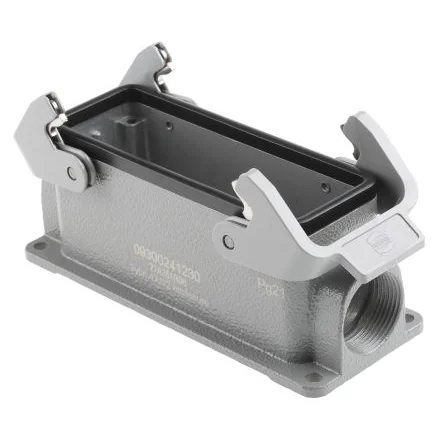 These connectors should not be mated or unmated under electrical load. Connectors of the same or different types arranged in a line should be polarised to prevent the possibility of wrong connection. UL, CSA, SEV. Hoods and Housings 24B. Brought to you by Harting, a comprehensive offering of hoods and housings from the Han 24B range. Compatible with a wide range of inserts, modules, frames including appropriate inserts from the Han D, DD, E, ES, EE, Com, E and Modular series. A strong metal body ensures optimum protecting for its relevant connectors. All models are highly reliable and excellent quality. Features ; Benefits. Metal bodied. Metric and Imperial cable glands are available separately, see stock no. ; 405-8845 405-8845 and ; 212-7668 212-7668. Option of 1 or 2 locking levers on the hoods, and the bulkhead or surface mounting housings