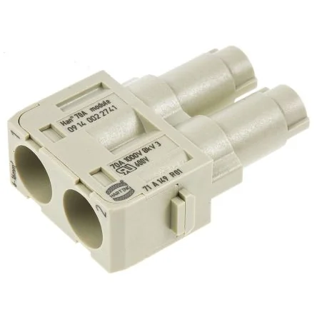 Han Axial Screw Module 70A. Axial-screw termination 2-pole 70A contacts for power circuits High 1000 Vac rating Coding pin allows polarisation of modules Male and female contacts are finger safe Mating cycles = 500
