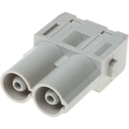 Han Axial Screw Module 70A. Axial-screw termination 2-pole 70A contacts for power circuits High 1000 Vac rating Coding pin allows polarisation of modules Male and female contacts are finger safe Mating cycles = 500