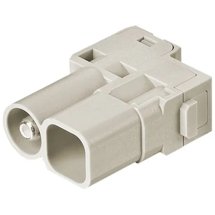 DIN EN 60 664-1, DIN EN 60 61984. Han 70A Hybrid Modules. Han Hybrid connectors feature a combination of contacts for power and signal, 1x70A and 4x16A, in male and female version connectors with differing wire gauge capacities, 6-16 mm and 14-22 mm. These Han Hybrid connectors, which belong to the Han Modular series, feature a durable light grey polycarbonate shell and have an axial screw power terminal. Crimp terminals are utilised for the signal connections. Operating temperature range minus -40 to +125°C Over 500 mating cycles