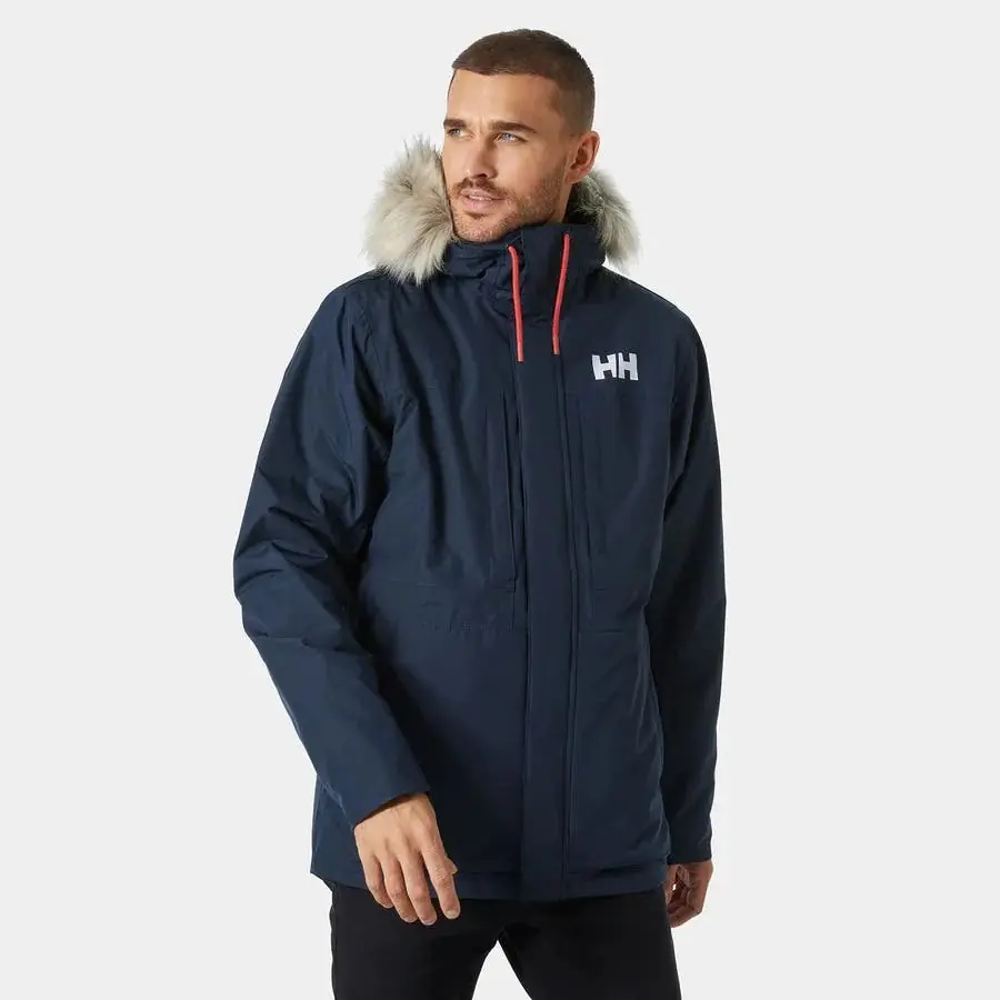 The Men's Coastal 3.0 Parka by Helly Hansen is a versatile, waterproof, and insulated jacket designed to provide protection and comfort for outdoor and urban adventures. Crafted with a combination of nylon and polyester fabrics, it offers excellent breathability and waterproofing. The parka features 133 g/m² PrimaLoft® Black Eco insulation, ensuring optimal warmth without added weight. Additional features include an adjustable hood, snap-button cuffs, a removable synthetic fur trim, and a two-layer construction. The jacket also includes a chest pocket with a YKK zipper, hand pockets with brushed lining, and fully sealed seams. The PFC-free DWR finish and recycled content highlight its commitment to sustainability.