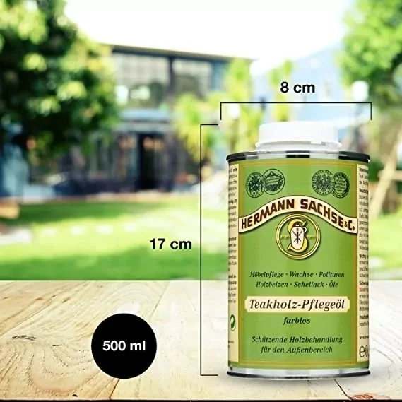 A colourless teak oil for pre - and post - treatment of outdoor furniture, hardwood care, outdoor wood surfaces, solid wood and veneers. Made in Germany