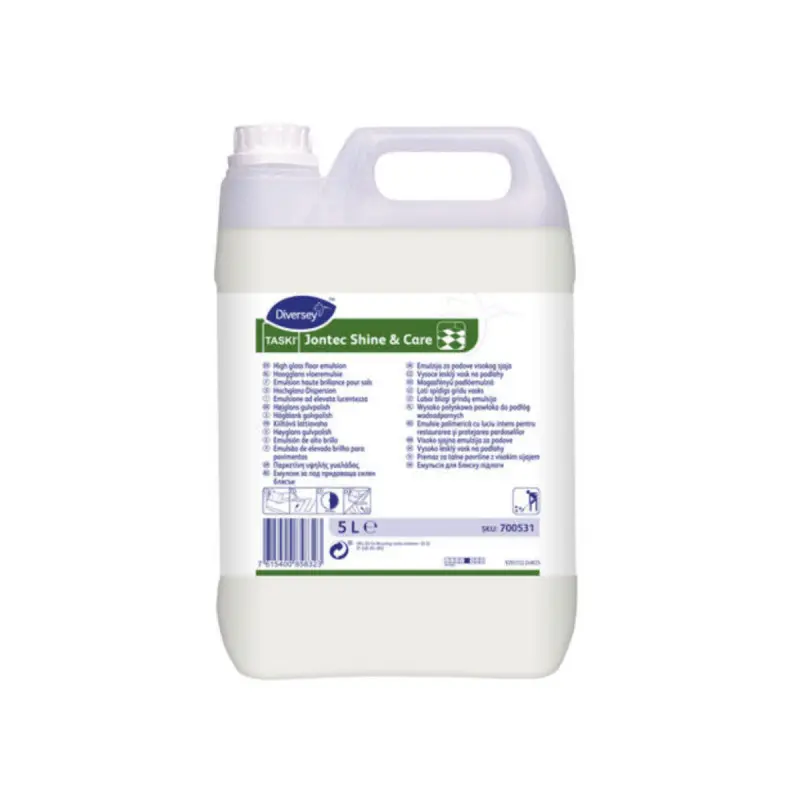 High Gloss Emulsion Floor Sols DIVERSEY Taski Jontec Eternum F2E - 5L anti-slip for all types of smooth hard floors that are water-resistant (PVC, linoleum, vinyl...). Its combination of specific polymers developed by Diversey allows for a prestigious shine while combining hardness, durability, and excellent adhesion. Suitable for application with conventional methods as well as with the TASKI ProSpeed applicator.
