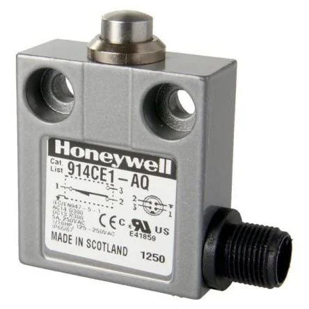 Products in the 914CE series will only meet IP and NEMA standards when used in non-hazardous locations. They only satisfy the requirements when installed properly (as per instruction) and completely. IP Rating: All models within the 914CE series meet IP65, IP66, IP67, IP68. This ensures that they are completely dust tight, offer protection against jets of water and can be immersed in water up to 3 m. NEMA Rating: Every 914CE limit switch also meets NEMA 1, 2, 3, 3R, 4, 6, 6P and 13 requirements. Type 1: Allows for indoor use and offers a dregree of protection against access to harzardous parts by personnel. Enclosures that meet NEMA 1 also protect the enclosure against foreign solid obkects(such as indoor dirt). Type 2: Allows for indoor use and provides a degree of protection against access to hazardous parts. The enclosures provide a degree of protection against foreign objects (such as falling dirt) and the ingress of water (light dripping or splashing). Type 3: Allows for indoor or outdoor use and provides a degree of protection against access to hazardous parts. The enclosures provide some protection from foreign objects (such as windblown dust) and the ingress of water (such as rain or snow). Enclosures that meet NEMA 3 offer protection against ice forming externally. Type 3R: Allows for indoor or outdoor use and provides a degree of protection against access to hazardous parts. The enclosures primarily provide ingress protection against water (such as rain, snow or sleet). Enclosures that meet NEMA 3 offer protection against ice forming externally. Type 4: Allows for indoor or outdoor use and provides a degree of protection against access to hazardous parts. The enclosures provide some protection from foreign objects (such as falling dirt and windblown dust) and the ingress of water (such as rain, snow or sleet alongside splashing water and hose directed water). Enclosures that meet NEMA 3 offer protection against ice forming externally. Type 6: Allows for indoor or outdoor use and provides a degree of protection against access to hazardous parts. The enclosures provide some protection from foreign objects (such as falling dirt and windblown dust) and the ingress of water (such as rain, snow or sleet alongside splashing water and hose directed water). Enclosures that meet NEMA 4 offer protection against ice forming externally. Type 6P: Allows for indoor or outdoor use and provides a degree of protection against access to hazardous parts. The enclosures provide some protection from solid objects (such as falling dirt and windblown dust) and the ingress of water (such as hose directed water). Enclosures that meet the NEMA 6P requirement also offer protection against water when being submerged at a limited depth. Type 13 : Enclosures that meet Type 13 are suited to harsh environments. Enclosures can be used indoors and provide protection against access to hazardous parts. They offer protection against solid objects such as falling dirt, windblown dirt, fibres and lint. They provide a level of protection from dripping and splashing water and other liquids such as the splashing, seepage and spraying of oil and non-corrosive coolants. 914CE limit switches are not emergency stop devices or safety devices. They must not be used in devices, applications and environments where injury can be incurred as a result of product failure. cURus, CE. Honeywell 914CE Miniature Limit Switches. The 914CE series of limit switches from Honeywell make up part of their miniature limit switches range. 914CE limit switches meet North America cURus and European CE standards, allowing them to be used in a vast array of environments. A choice of actuator ensures that you will be able to find a miniature limit switch that meets your applicatoin nees. Features:. 914CE limit switches feature gang mounting capability. A range of different cable lengths are available. These limit switches are able to function over a wide operating temperature range of -40 °C to +75 °C. 914CE limit switches are long lasting and have a mechanical life span up to 10 million operations for standard actuators and plungers. Wobble stick or cat whisker actuators have a life span of 5 million operations. An integrated quick blow fuse acts as a short circuit protection device (SCPD). Benefits:. 914CE limit switches are particularly suited to applications with limited space. They have a compact design and feature a 25 mm hole-hole mounting footprint. The mounting holes for screwing the limit switch into place are counter-bored. This means that the screw heads fit within the housing of the unit, and no additional real estate is required when mounting the switch. Installation of 914CE limit switches is quick and easy. Each unit only requires two M5 (or #10) screws for mounting. Pre-leaded cables and M12 micro-change connectors minimise installation time. This series offers a great deal of design flexibility. You can choose the most appropriate cable length and whether the cable or connector exits the unit at the side or bottom. These switches are supplied with either an M12 micro-change four-pin connector or are pre-leaded with UL cable. Utilising the gang mounting capability, you can build your own multiple plunger switch using models with a pin plunger or roller plunger. When using this functionality, there is a 16mm distance between the plungers. You also have the ability to incoroporate a limit switch with a lever actuator or with lever functionality at the end of the row. 914CE limit switches are constructed with diecast zinc housing. Each unit within the 914CE series incorporates a fluorocarbon sealing diaphragm that offers protection and enhances reliability. An epoxy sealant has also been used to encapsulate the cable, connector and switch terminals. The factory sealing and sealant protects the integrity of the limit switch and you can trust this limit switch to perform consistently and accurately within the most rugged environments. 