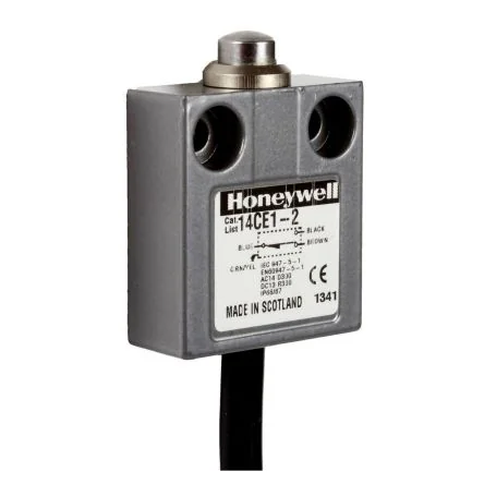 The Honeywell All MICRO SWITCH™ 14CE Series miniature precision switches incorporate fluorocarbon diaphragm sealing to provide reliable protection, meeting IP65, IP66, IP67, and IP68, as well as NEMA 1, 2, 3, 3R, 4, 6, 6P, and 13 requirements. Versions with a boot seal also meet NEMA 12 requirements (dust, falling dirt, liquid media with solid contaminates).Rugged, miniature construction means minimal real estate on equipment NEMA 1, 2, 3, 3R, 4, 6, 6P, 12 (boot seal), 13, and IP65/66/67/68 environmental sealing Pre-leaded (Cenelec cable) or supplied with a M12 four-pin connector Wide selection of actuators and cable length variations with side and bottom exit cable/connector options 25 mm mounting centres engineered with a MICRO SWITCH SM switch for consistent, precise actuation Well suited for up to 10 million actuation cycles (Up to 5 million actuation cycles for wobble actuators) Gang mounting capability to provide a multi plunger limit switch
