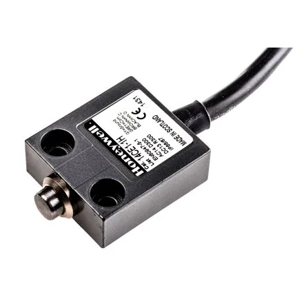 IP Rating: All models within the 14CE series meet IP65, IP66, IP67, IP68. This ensures that they are completely dust tight, offer protection against jets of water and can be immersed in water up to 3 m. NEMA Rating: Every 14CE limit switch also meets NEMA, 2, 3, 3R, 4, 6, 6P and 13 requirements. Type 2 : Allows for indoor use and provides a degree of protection against access to hazardous parts. The enclosures provide a degree of protection against foreign objects (such as falling dirt) and the ingress of water (light dripping or splashing). Type 3: Allows for indoor or outdoor use and provides a degree of protection against access to hazardous parts. The enclosures provide some protection from foreign objects (such as windblown dust) and the ingress of water (such as rain or snow). Enclosures that meet NEMA 3 offer protection against ice forming externally. Type 3R: Allows for indoor or outdoor use and provides a degree of protection against access to hazardous parts. The enclosures primarily provide ingress protection against water (such as rain, snow or sleet). Enclosures that meet NEMA 3 offer protection against ice forming externally. Type 4: Allows for indoor or outdoor use and provides a degree of protection against access to hazardous parts. The enclosures provide some protection from foreign objects (such as falling dirt and windblown dust) and the ingress of water (such as rain, snow or sleet alongside splashing water and hose directed water). Enclosures that meet NEMA 3 offer protection against ice forming externally. Type 6: Allows for indoor or outdoor use and provides a degree of protection against access to hazardous parts. The enclosures provide some protection from foreign objects (such as falling dirt and windblown dust) and the ingress of water (such as rain, snow or sleet alongside splashing water and hose directed water). Enclosures that meet NEMA 4 offer protection against ice forming externally. Type 6P: Allows for indoor or outdoor use and provides a degree of protection against access to hazardous parts. The enclosures provide some protection from solid objects (such as falling dirt and windblown dust) and the ingress of water (such as hose directed water). Enclosures that meet the NEMA 6P requirement also offer protection against water when being submerged at a limited depth. Type 13: Enclosures that meet Type 13 are suited to harsh environments. Enclosures can be used indoors and provide protection against access to hazardous parts. They offer protection against solid objects such as falling dirt, windblown dirt, fibres and lint. They provide a level of protection from dripping and splashing water and other liquids such as the splashing, seepage and spraying of oil and non-corrosive coolants. 14CE limit switches are not emergency stop devices or safety devices. They must not be used in devices, applications and environments where injury can incur as a result of product failure. CE. 14CE Series Miniature Limit Switches. The 14CE series of limit switches from Honeywell form part of their miniature limit switches range. This series is compact, precise and highly versatile. They have been designed for use in a wide range of environments. A choice of actuator ensures that you will be able to find the right limit switch to meet your application. Features:. 14CE limit switches have gang mounting capability. A range of different cable lengths are available. These limit switches feature a wide operating temperature range of -40 °C to +75 °C. Excellent mechanical life up to 10 million operations for standard plungers and actuators. Wobble stick or cat whisker actuators have a life span of 5 million operations. Benefits:. 14CE limit switches are ideal for applications with limited space. They have a compact design and feature 25 mm mounting centres. The mounting holes for screwing the limit switch into place are counter-bored. This means that the screw heads fit within the housing of the unit, and no additional real estate is required when mounting the switch. Installation of 14CE limit switches is quick and easy. Each unit only requires two M5 screws for mounting. Pre-leaded cables and M12 connectors also help to minimise installation time. This series offers a great deal of design flexibility. You can choose the most appropriate cable length and whether the cable or connector exits the unit at the side or bottom. These switches are supplied with an M12 four-pin connector or are pre-leaded with Cenelec cable. Utilising the gang mounting capability, you can build your own multiple plunger switch using models with a pin plunger or roller plunger. 14CE limit switches are constructed with diecast zinc housing. Each unit within the 14CE series incorporates a fluorocarbon sealing diaphragm that offers protection and enhances reliability. An epoxy sealant has also been used to encapsulate the cable, connector and switch. The factory sealing and sealant protects the integrity of the limit switch and you can trust this limit switch to perform consistently and accurately within the most rugged environments. They will function as expected in environments where petrol, water based or synthetic fluids are present. Applications:. 14CE limit switches are incredibly versatile and can be used in extreme temperature and harsh environments. Example product applications include: Machine tools: You can use 14CE limit switches to detect tools, or the location of pieces or parts on a CNC tool. Off-road equipment: 14CE models can be used in crane booms (crane jibs) as a cab door switch. Material handling: 14CE limit switches can be utilised in vehicle wash systems and forklift trucks. They are ideal for use within dock locks for trucks and trailers. Textile and print trade machinery: Applications include tensioning, sensing of roll sizes, controlling panels and gates. Access and mobility solutions: Stairway and vehicle wheelchair lifts use 14CE switches, to monitor movement. Robotics: This se