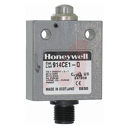 Products in the 914CE series will only meet IP and NEMA standards when used in non-hazardous locations. They only satisfy the requirements when installed properly (as per instruction) and completely. IP Rating: All models within the 914CE series meet IP65, IP66, IP67, IP68. This ensures that they are completely dust tight, offer protection against jets of water and can be immersed in water up to 3 m. NEMA Rating: Every 914CE limit switch also meets NEMA 1, 2, 3, 3R, 4, 6, 6P and 13 requirements. Type 1: Allows for indoor use and offers a dregree of protection against access to harzardous parts by personnel. Enclosures that meet NEMA 1 also protect the enclosure against foreign solid obkects(such as indoor dirt). Type 2: Allows for indoor use and provides a degree of protection against access to hazardous parts. The enclosures provide a degree of protection against foreign objects (such as falling dirt) and the ingress of water (light dripping or splashing). Type 3: Allows for indoor or outdoor use and provides a degree of protection against access to hazardous parts. The enclosures provide some protection from foreign objects (such as windblown dust) and the ingress of water (such as rain or snow). Enclosures that meet NEMA 3 offer protection against ice forming externally. Type 3R: Allows for indoor or outdoor use and provides a degree of protection against access to hazardous parts. The enclosures primarily provide ingress protection against water (such as rain, snow or sleet). Enclosures that meet NEMA 3 offer protection against ice forming externally. Type 4: Allows for indoor or outdoor use and provides a degree of protection against access to hazardous parts. The enclosures provide some protection from foreign objects (such as falling dirt and windblown dust) and the ingress of water (such as rain, snow or sleet alongside splashing water and hose directed water). Enclosures that meet NEMA 3 offer protection against ice forming externally. Type 6: Allows for indoor or outdoor use and provides a degree of protection against access to hazardous parts. The enclosures provide some protection from foreign objects (such as falling dirt and windblown dust) and the ingress of water (such as rain, snow or sleet alongside splashing water and hose directed water). Enclosures that meet NEMA 4 offer protection against ice forming externally. Type 6P: Allows for indoor or outdoor use and provides a degree of protection against access to hazardous parts. The enclosures provide some protection from solid objects (such as falling dirt and windblown dust) and the ingress of water (such as hose directed water). Enclosures that meet the NEMA 6P requirement also offer protection against water when being submerged at a limited depth. Type 13 : Enclosures that meet Type 13 are suited to harsh environments. Enclosures can be used indoors and provide protection against access to hazardous parts. They offer protection against solid objects such as falling dirt, windblown dirt, fibres and lint. They provide a level of protection from dripping and splashing water and other liquids such as the splashing, seepage and spraying of oil and non-corrosive coolants. 914CE limit switches are not emergency stop devices or safety devices. They must not be used in devices, applications and environments where injury can be incurred as a result of product failure. cURus, CE. Honeywell 914CE Miniature Limit Switches. The 914CE series of limit switches from Honeywell make up part of their miniature limit switches range. 914CE limit switches meet North America cURus and European CE standards, allowing them to be used in a vast array of environments. A choice of actuator ensures that you will be able to find a miniature limit switch that meets your applicatoin nees. Features:. 914CE limit switches feature gang mounting capability. A range of different cable lengths are available. These limit switches are able to function over a wide operating temperature range of -40 °C to +75 °C. 914CE limit switches are long lasting and have a mechanical life span up to 10 million operations for standard actuators and plungers. Wobble stick or cat whisker actuators have a life span of 5 million operations. An integrated quick blow fuse acts as a short circuit protection device (SCPD). Benefits:. 914CE limit switches are particularly suited to applications with limited space. They have a compact design and feature a 25 mm hole-hole mounting footprint. The mounting holes for screwing the limit switch into place are counter-bored. This means that the screw heads fit within the housing of the unit, and no additional real estate is required when mounting the switch. Installation of 914CE limit switches is quick and easy. Each unit only requires two M5 (or #10) screws for mounting. Pre-leaded cables and M12 micro-change connectors minimise installation time. This series offers a great deal of design flexibility. You can choose the most appropriate cable length and whether the cable or connector exits the unit at the side or bottom. These switches are supplied with either an M12 micro-change four-pin connector or are pre-leaded with UL cable. Utilising the gang mounting capability, you can build your own multiple plunger switch using models with a pin plunger or roller plunger. When using this functionality, there is a 16mm distance between the plungers. You also have the ability to incoroporate a limit switch with a lever actuator or with lever functionality at the end of the row. 914CE limit switches are constructed with diecast zinc housing. Each unit within the 914CE series incorporates a fluorocarbon sealing diaphragm that offers protection and enhances reliability. An epoxy sealant has also been used to encapsulate the cable, connector and switch terminals. The factory sealing and sealant protects the integrity of the limit switch and you can trust this limit switch to perform consistently and accurately within the most rugged environments. 