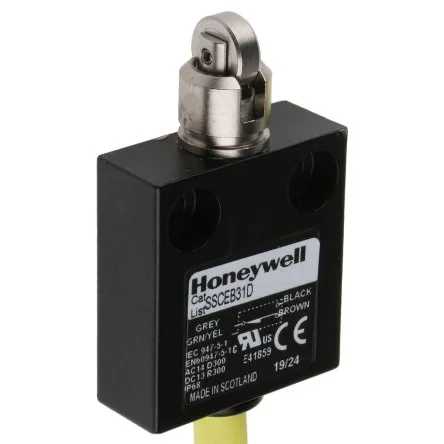 Honeywell SSCE Super Sealed CE Limit Switches. SSCE limit switches form part of Honeywell ‘s wider miniature limit switches range. They are precise and reliable, even in the toughest environments. These ‘Super Sealed ‘ CE switches are able to function as normal while full submerged in a variety of different fluids. Features:. SSCE series limit switches feature gang-mounting capability. They have two 25 mm mounting centres. SSCE limit switches are pre-wired with 3 meter long PUR (Polyurethane) cable. They can be used for multiple switching within confined spaces. This series of limit switches are constructed from a rugged die-cast zinc housing. Excellent mechanical lifespan up to 10 million operations. Snap action contacts. Benefits:. With a compact design, SSCE limit switches can be used in applications where space is limited and a switch with a small footprint is required. They are quick and easy to install, with a simple two-screw mounting design and pre-wired PUR cable. The use of polyurethane (PUR) for the cable, also enhances SSCE limit switches ability to withstand harsh conditions. PUR sheathing remains flexible through a wide range of temperatures and has anti-kink properties. It is difficult to cut and incredibly wear resistant. It also offers resistance to humidity, UV radiation and as a barrier to oils and chemicals. Unlike many other limit switches from Honeywell, SSCE series are fitted with gold plated contacts instead of silver contacts. Some environmental conditions, such as submersion in liquid, or the presence of moisture can cause silver contacts to tarnish. These conditions do not affect the gold plated contacts, giving SSCE switches greater reliability when switching at low voltages and low currents. Gold plating protects the contacts from contamination while in storage before use as well as during operation. You can build your own multiple plunger switch by using the SSCE series ‘ gang mounting capability. Applications:. SSCE series limit switches are suitable for applications that require a limit switch to be fully submerged in liquid. They are robust and rugged and can handle harsh applications.