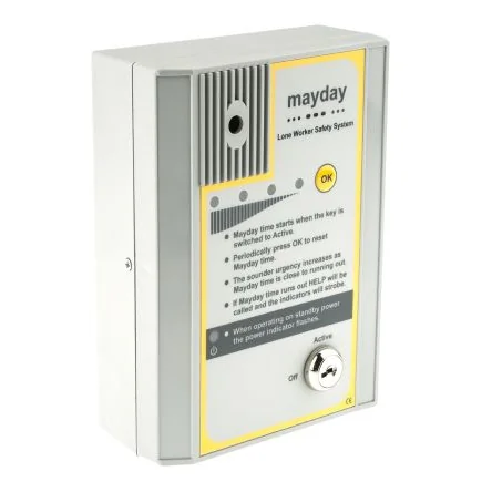 The MAYDAY is mains powered and supplied with a rechargeable 12v 0.8Ahr standby battery The integral 12v power supply will deliver 150ma for ancillary items. Lone Worker Safety System. The MAYDAY LONEWORKER safety system is designed to raise an alarm if a lone worker becomes incapacitated. Once the Mayday is armed, the primary countdown timer 20 - 60 minutes is started and indication is given by countdown LED's. At the end of the primary period the secondary timer 2 - 10 minutes starts and an audible and visual warning is given to prompt the lone worker to acknowledge there presence by pressing the OK button. As the timer approaches time out, the indications become more urgent. If the lone worker fails to respond the Mayday signals for assistance. On Off keyswitch to arm the unit and secure reset OK button to restart the countdown timer and reset the alarm A green Power On LED Four red System Active countdown LED's An integral piezo sounder. (100db at 1m) Two adjustable countdown timer controls