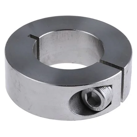 Durable stainless steel shaft collar with clamp screw for secure installation and corrosion resistance.