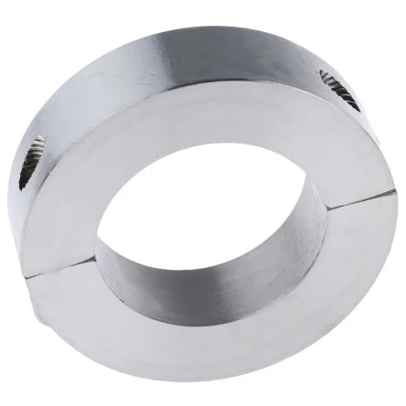 Durable two-piece shaft collar with clamp screw for secure installation and corrosion resistance.