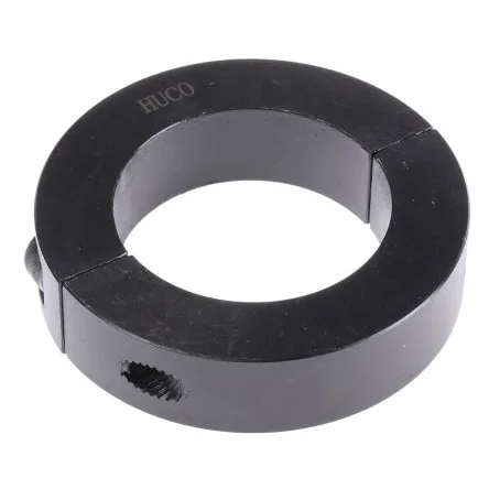 Durable two-piece shaft collar with clamp screw for easy installation and secure grip.