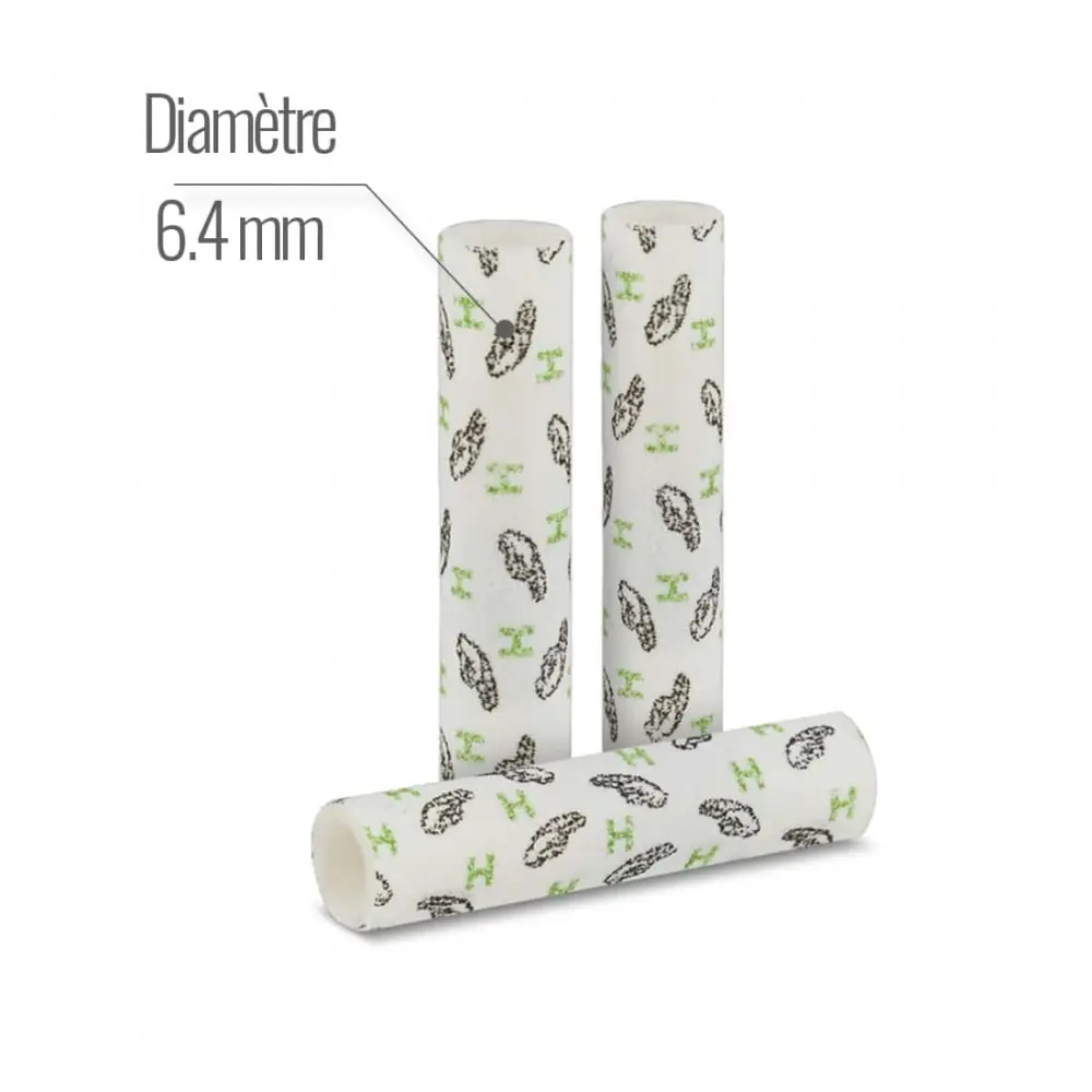 airtight resealable bag of 250 filters. these filters are made of cellulose and activated carbon helping to reduce impurities and nicotine. they measure 6.4 mm in diameter and 30 mm in length.