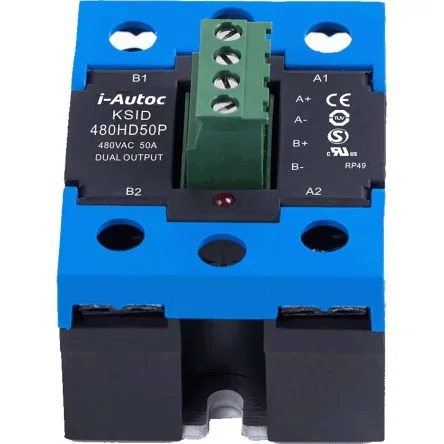 KSID Series 2 Channel SSR. I-Autoc KSID series two channel AC output solid state relay. KSID relays have various control voltage options with load currents at 25A and 50A available. The relays can be used for resistive, inductive or capacitive loads. AC output Zero crossing or Random-on SCR output LED indication Opto-isolation IP20 safety cover protection RoHS compliant
