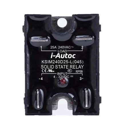 KSIM 045 Series Single Phase SSR. I-Autoc KSIM (045) series single phase AC output solid state relay. KSIM relays have a control voltage of 4 V dc to 32 V dc with load currents at 10A, 16A or 25A. The relays feature a triac output and can used for resistive, inductive or capacitive loads suitable for use in industrial applications. AC output Zero crossing or Random-on LED indication Opto-isolation Faston quick connect tabs RoHS compliant