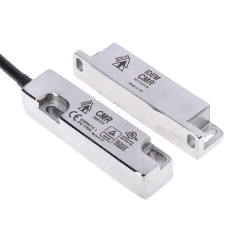 EN1088 (ISO 14119), EN 60947-5-1, EN 60204-1, ISO 13849-1, EN 62061, UL 508. CE, cULus, TUV. Actuator. The normally closed (NC) circuits are closed when the guard is closed and the actuator is present. IDEM HYGIEMAG CMR Non Contact Safety Switch. The HYGIEMAG CMR safety switch has been developed for non-contact guard door interlocking of hinged, sliding or removable guard doors. It is ideal for applications that require a wide tolerance to misalignment, a high switching capacity or high levels of hygiene. When used with dual channel safety relays, the CMR safety switch can be used to provide up to PLe/Category 4 to ISO13849-1 protection. Features and Benefits. Magnetic high-power switching Dual channel safety outputs Stainless steel 316 housing High temperature stability up to 105°C Can be mounted on steel structures High tolerance to guard misalignment IP69K protection Conformance to EN60947-5-3 PDF-S Up to PLe ISO 13849-1 Slim fitting for all industry applications Suitable for food contact zones - EHEDG Guidelines Mirror Polished Finish to Ra4 Suitable for CIP and SIP cleaning Easy to install within narrow frame structures Operates from two sides for ease of applications 2NC / 1 NO 12 mm wide sensing Switching capacity 1 A 55 ; 73 mm fixing centres Housing: 20.6 x 85 x 17 mm. Applications. The HYGIEMAG CMR non-contact safety switch is ideal for the food processing, pharmaceutical, packaging and chemical industries.