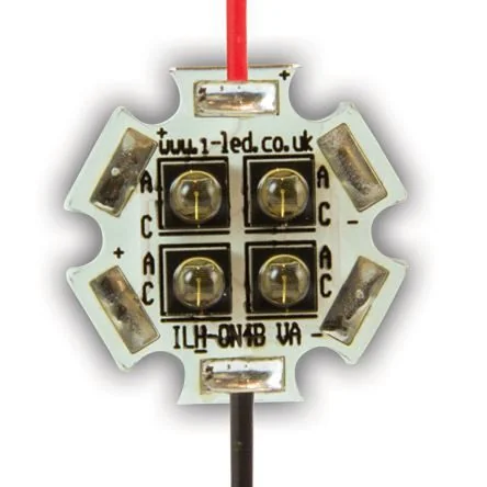 At the heart of each PowerStar are 4 IR OSLON® Black Series LEDs from OSRAM Opto Semiconductors, which are today’s smallest infrared LEDs with more than one watt of optical power. The small package with an integrated lens allows superior, compact arrangements of very high power density. PowerStars are compact, powerful LED light sources built on aluminium substrates for optimal thermal management. Available with 200mm wires as standard.Applications Surveillance systems IR illumination for cameras Machine vision Night vision light Driver assistance systems